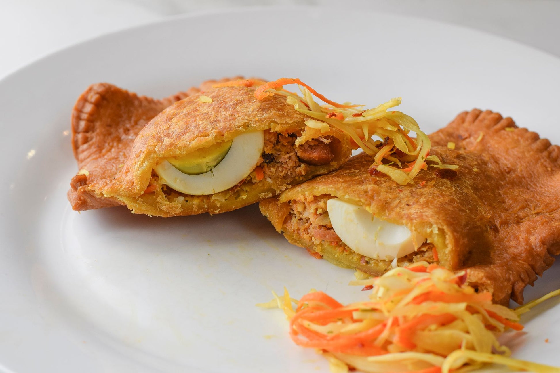 Chicken-filled pastry with boiled egg, sausage, shredded cabbage and carrot slaw.